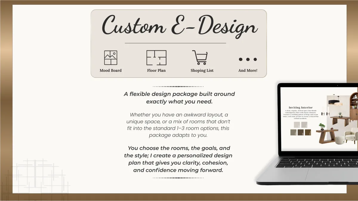 • Custom mood board • 2D floor plan • Product sourcing budget-friendly • Paint and color palette options • Styling recommendations • Full clickable shopping list • One complimentary round of revisions • A design call to review your space and goals • Clear, step-by-step instructions for implementation